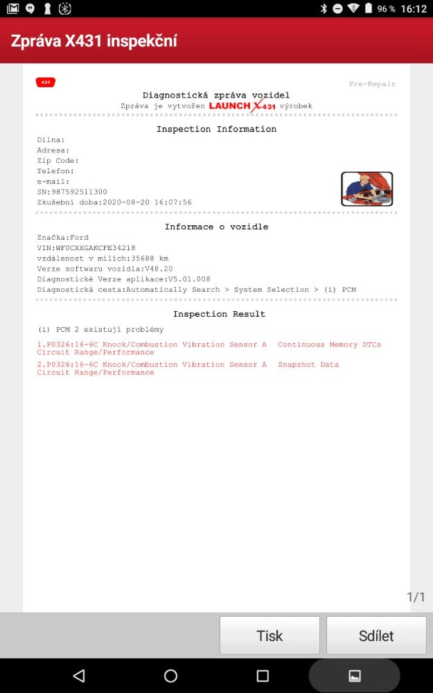 Výpis z diagnostiky říká něco o problému s čidlem klepání A.