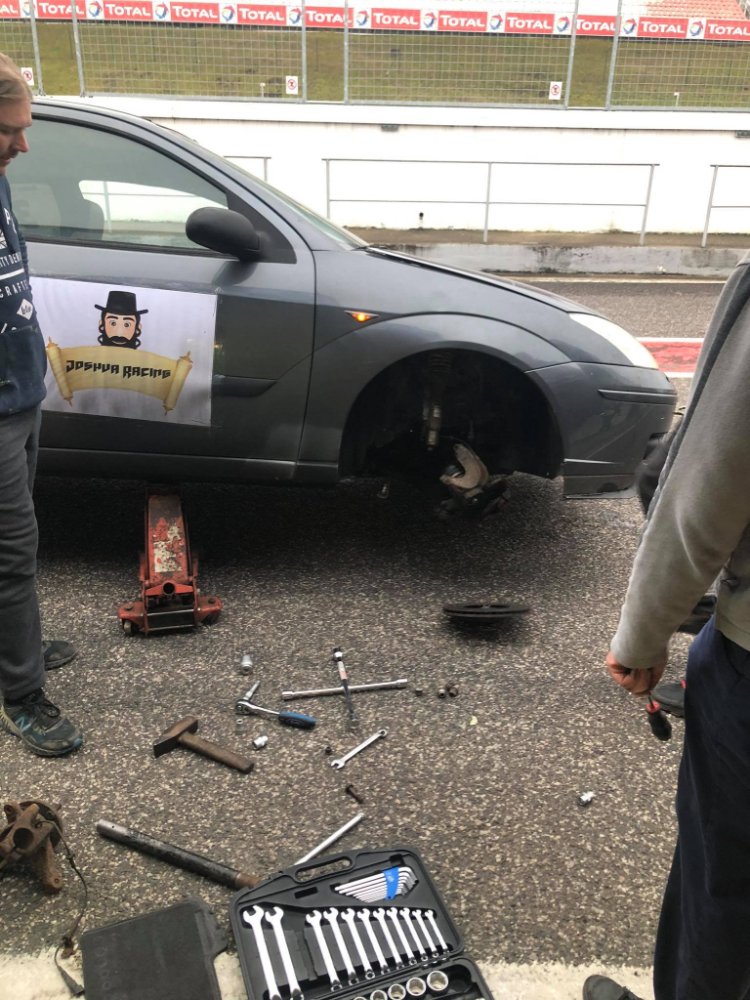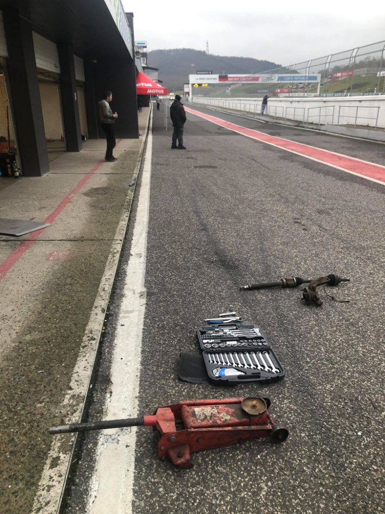 Hodně lidí se ptalo, jestli to stihneme vyměnit, že to není možné. Ti z Vás, co znáte rOmika, asi předem tušíte, že to možný je! :mrgreen: Byla to akce hodně narychlo, takže se vyměnila těhlice a poloosa. Středová matice chyběla, chtěli jsme ji použít z mého daily ST, ale za boha nešla povolit. Takže jsme narychlo nasadili kolo a bo pomalu vyjelo depem. Závod skončil.