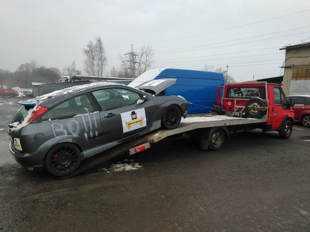 Malé seznámení s BO!!! - Jedná se o standartní šedý Focus ST170. Někteří z Vás ho znají důverně jako třískově vyhlížejícího Focuse na rOmikově odtahovce z Vysokého Mýta, kde dělal velké bububu v technických pasážích i na majitele Focusů RS Mk1. Ano, je to stále jeden a ten stejný Focus, který byl po Vysokém Mýtě odstaven na dvorku.