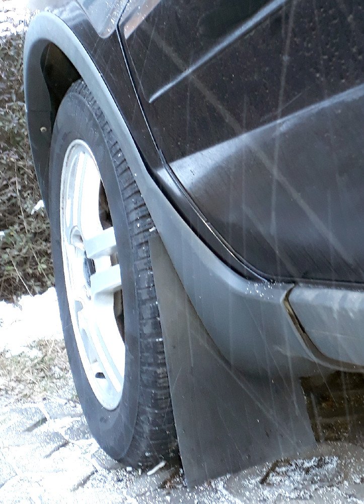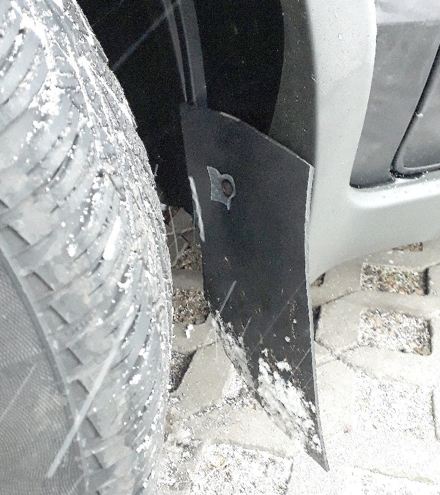 Přistoupil jsem tedy ke "gumové verzi" zástěrek, které jsem upevnil na jeden vhodně situovaný šroub do podběhu (podloženo plastovými podložkami z obou stran, aby si ta guma lépe sedla). Uznávám, že to z pohledu zatékání vody mezi plastový podběh a plechový okraj prahu to stále není dokonalé, ale ten hlavní cíl (aby se nešpinily dveře a nelítaly na ně kamíky) to tak nějak plní. Navíc, ta černá guma není tak pohledově nápadná jako ty bílé plastové plácačky...